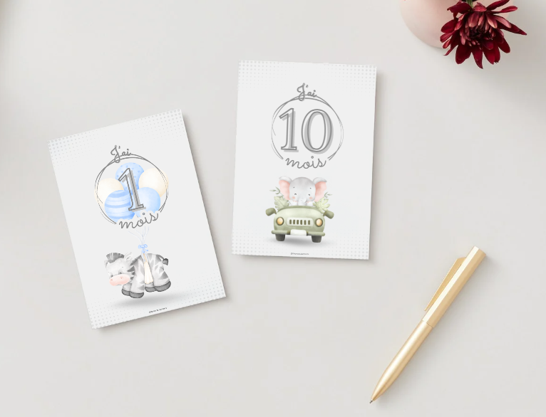 - Les cartes “mois par mois” (A5) : de la naissance à 1 an, 12 cartes illustrées pour suivre la croissance de bébé. Chaque mois, une photo souvenir pleine d’amour.
