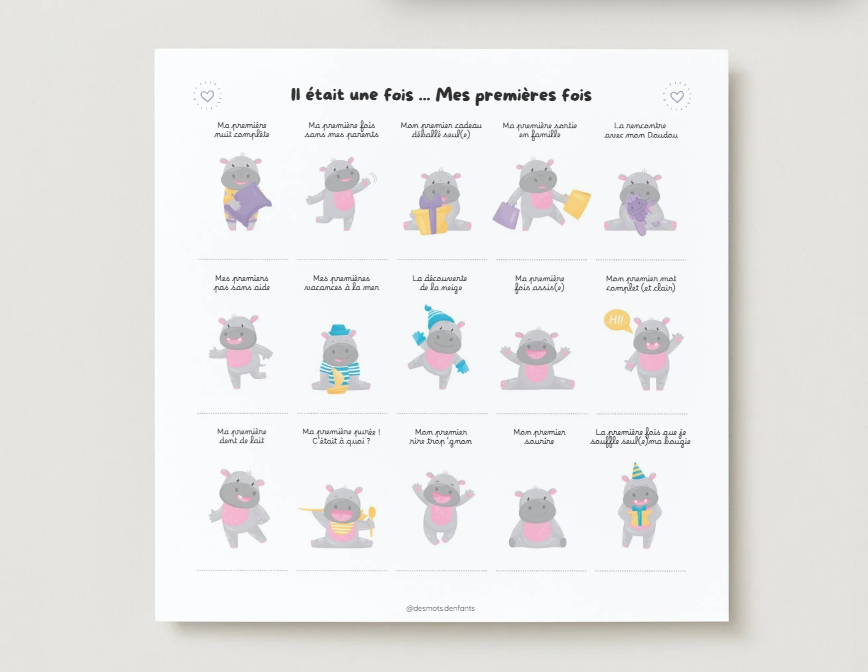 - L'affiche "Il était une fois... mes premières fois" : de sa première dent à ses premiers pas : 15 dates à compléter et à mettre dans un joli cadre. Parfaites pour garder une trace de chaque grande étape !